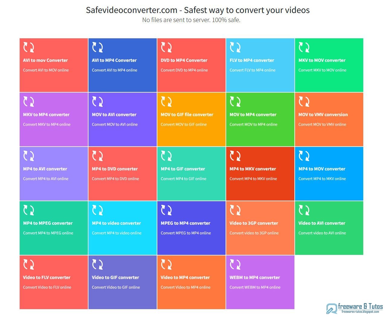 Safevideoconverter est un outil en ligne qui permet de convertir facilement des vidéos dans plusieurs autres formats. Il se présente sous la forme d'une collection d'outils (plus de 30 !) affiliés chacun à une tâche bien précise : convertir en MP4, en MKV, en AVI, etc.